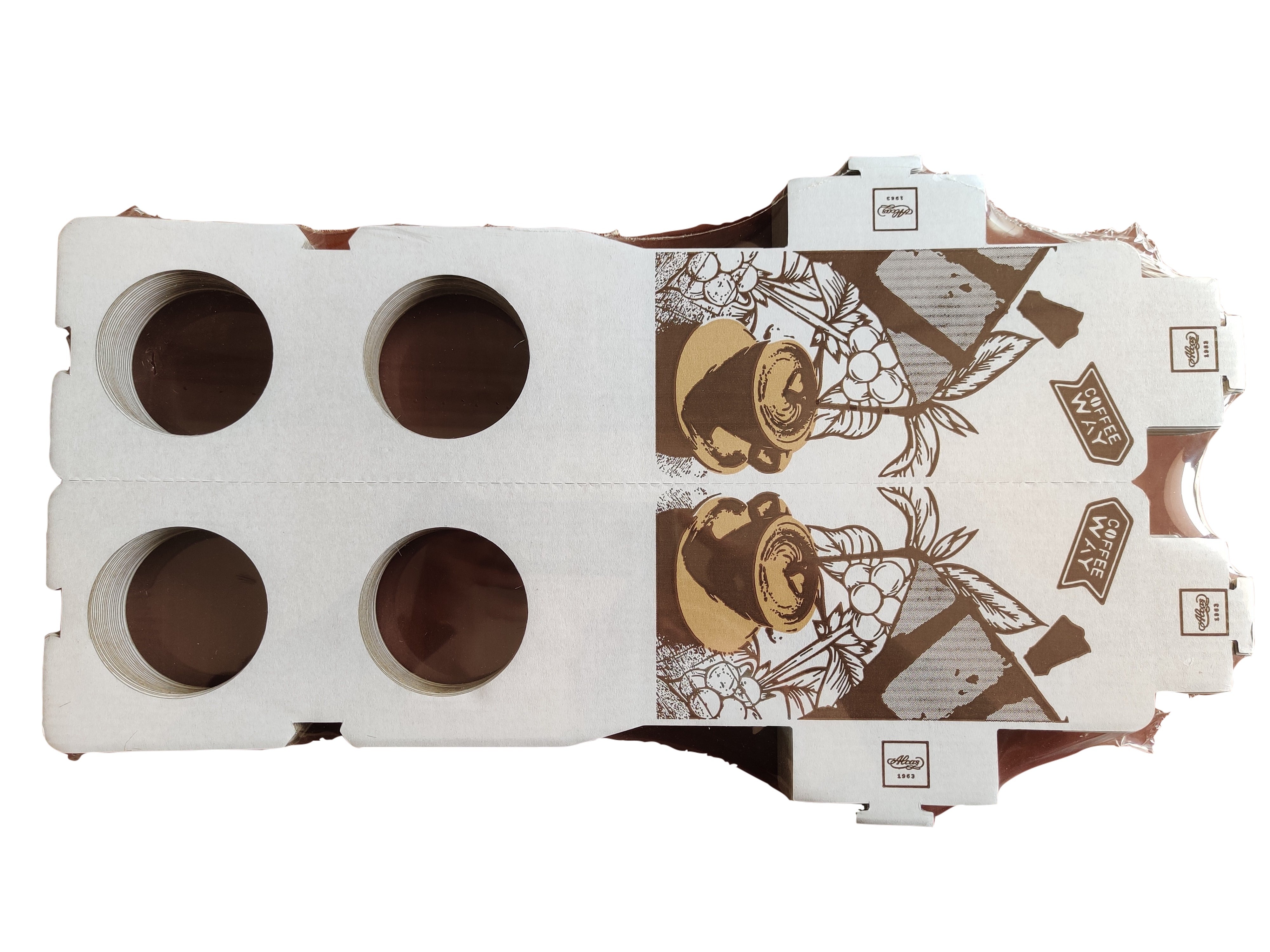 Vassoi in cartone porta cappuccino. Questi vassoi consentono l'asporto fino a 4 bicchieri. Ideali per il trasporto di bevande, in particolare cappuccini.